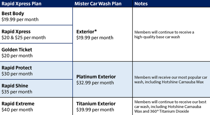 3. Members will be transitioned to Mister’s Unlimited Wash Club program and will adopt the Mister plans and pricing as shown below: